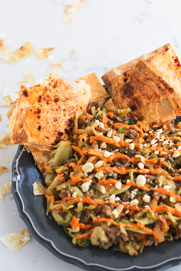 What do you do when you’re craving an egg roll, but want something a little healthier? You dive into a giant bowl of this not-fried Egg Roll Bowl. Savory meat, bright Asian flavors, and lots of tender cabbage — you will be kickin’ that greasy, cold takeout egg roll to the curb! Top it with crunchy wontons for the full egg roll experience.