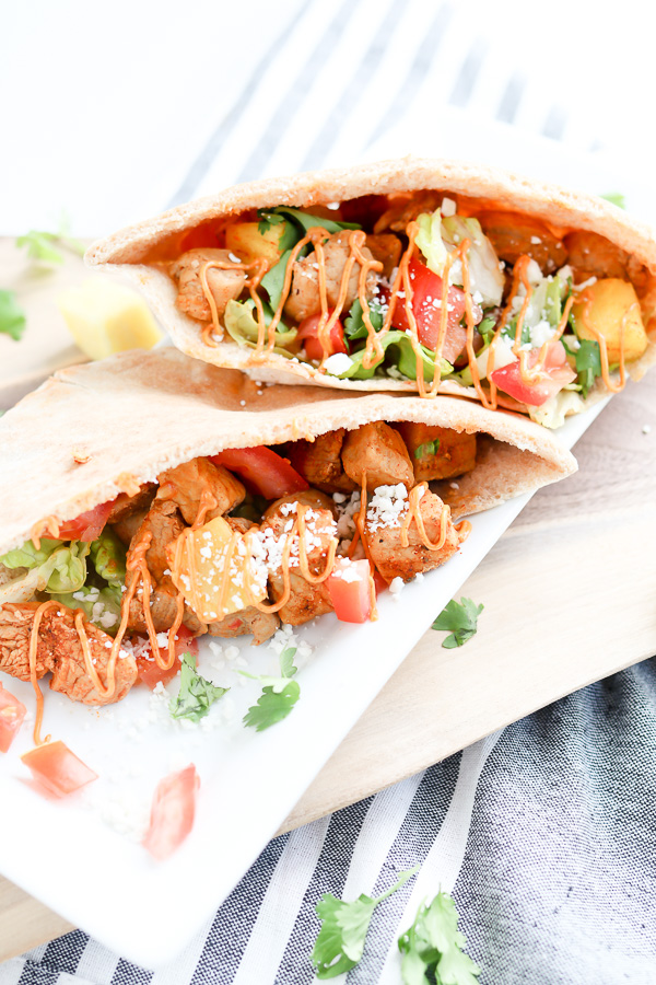 Fun to say and even more fun to eat, this Paprika Pineapple Pork is a smoky, sweet, flavor explosion! Tender bites of pork in a sweet paprika sauce, plus juicy bites of pineapple all stuffed inside a warm pita — this one will please the entire table, no problem! Top it with a drizzle of chipotle mayo, diced tomato, shredded lettuce, and crumbled cotija cheese for a real treat!