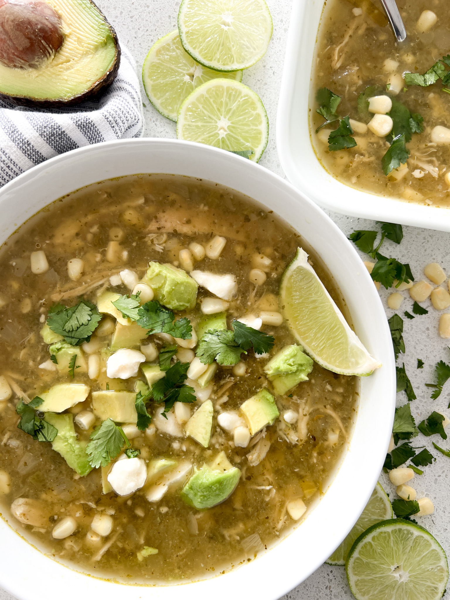 When you’re craving chili but want a lighter version, this soup is here to shine! This light salsa verde broth with shredded chicken and sweet corn is perfect for every season of the year. Delightful as is, but toppings are definitely welcome here! Options include shredded cheese or feta cheese, sour cream, diced avocado, cilantro, and/or crushed tortilla chips.